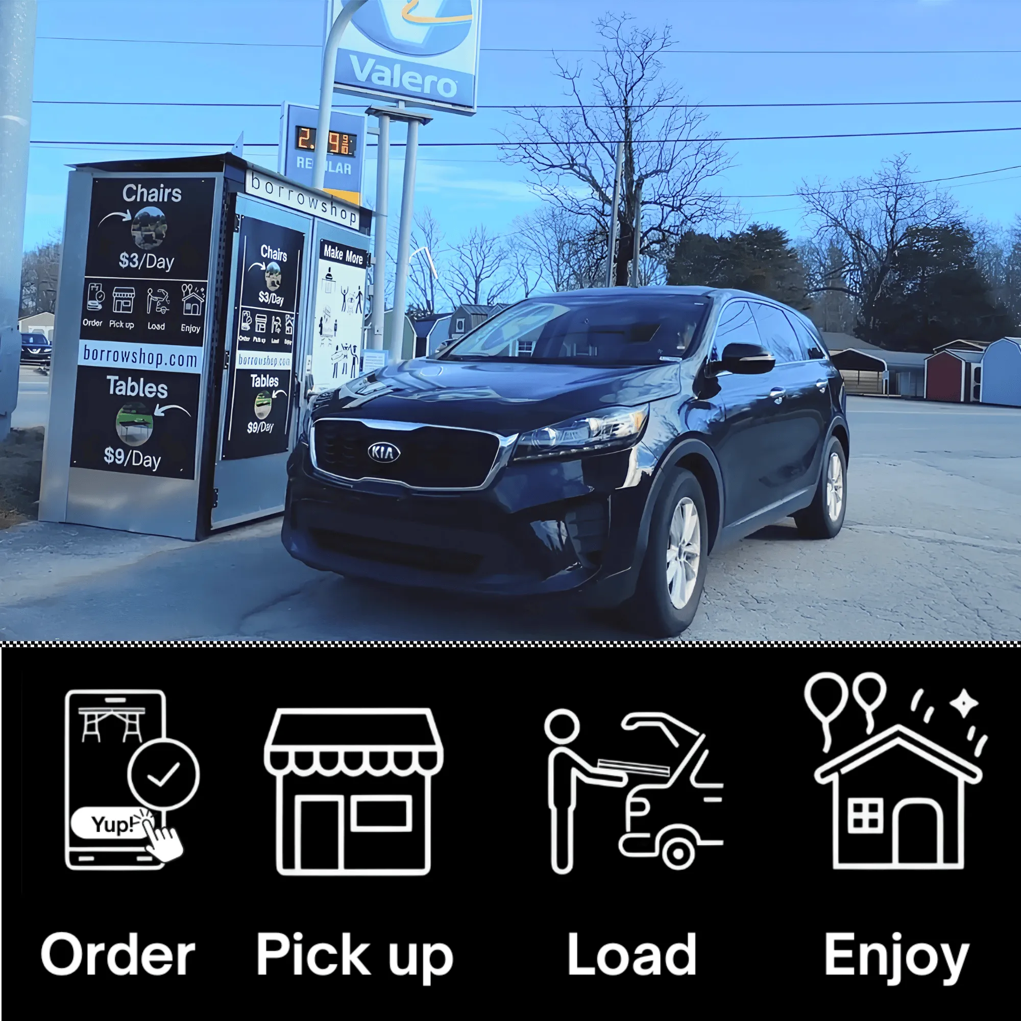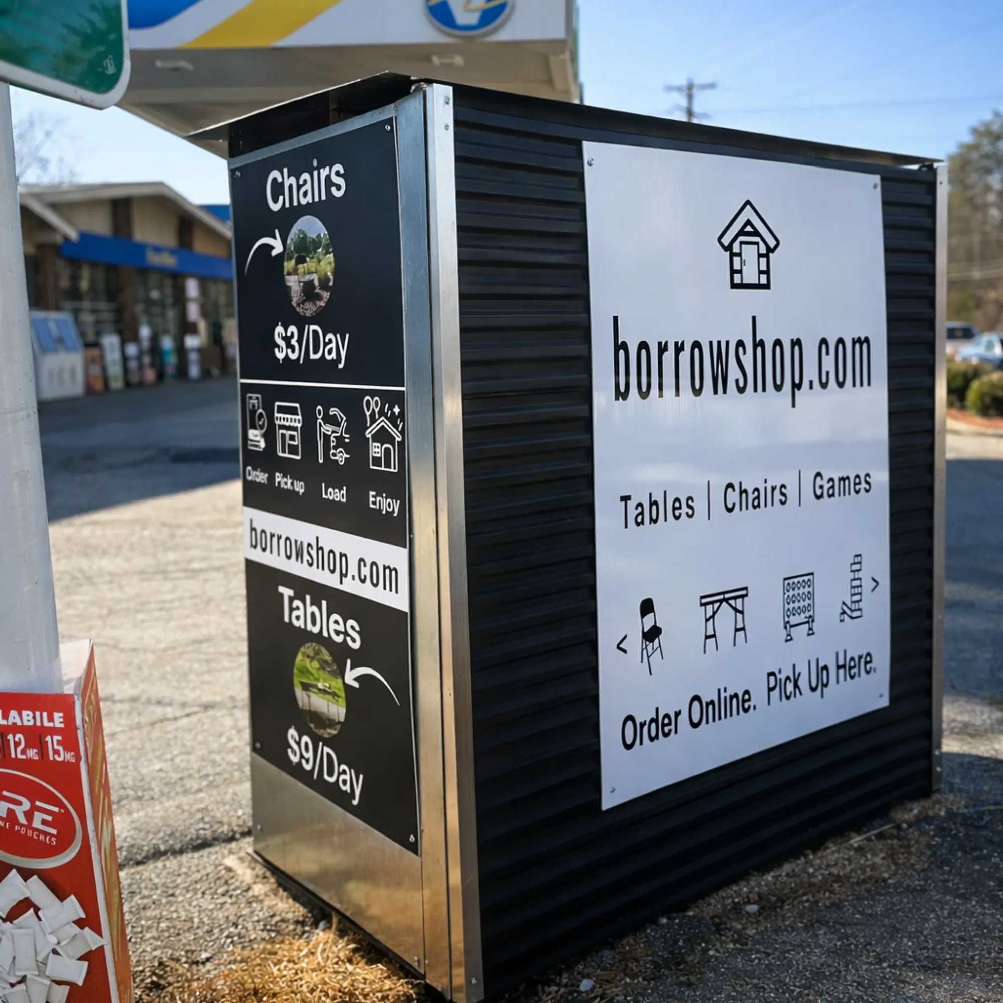 **We rent all of our items on a daily basis at borrowshop using a self-service access system. Customers will need to arrive at our location with a suitable vehicle (we recommend SUV, Van, Truck, or Trailer) to pick up and load their own orders with, as well as return the items to our shop when they are due back.